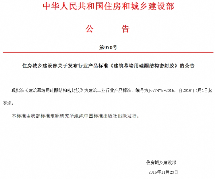 2015年11月23日住房城鄉(xiāng)建設(shè)部關(guān)于發(fā)布行業(yè)產(chǎn)品標準《建筑幕墻用硅酮結(jié)構(gòu)密封膠》的公告,此公告批準《建筑幕墻用硅酮結(jié)構(gòu)密封膠》為建筑工業(yè)行業(yè)產(chǎn)品標準,編號為JG/T475-2015,自2016年4月1日起實施。具體官方文件內(nèi)容如下: