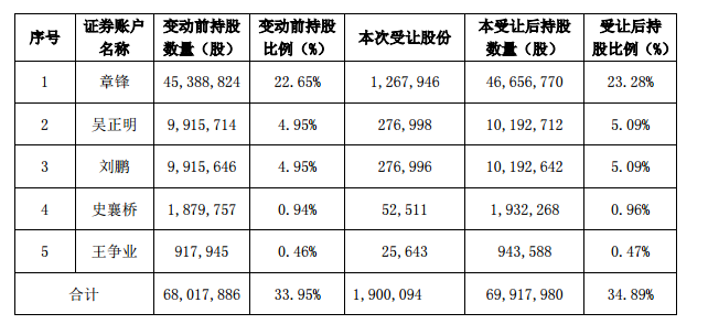 公司董事長章鋒、董事吳正明、董事劉鵬、董事、總經(jīng)理王爭業(yè)、副總經(jīng)理趙勇剛為公司一致行人,本次受讓前合計持股數(shù)量為 69,102,734 股,持股比例為34.48%,本次受讓后合計持股數(shù)量為 71,002,828 股,持股比例為 35.43%。