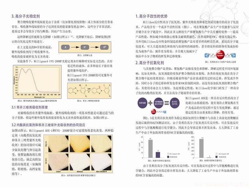 由于美利肯高分子抗氧劑具有反應(yīng)性,可在發(fā)泡反應(yīng)過程中與異氰酸酯進(jìn)行化學(xué)鍵合,因此不會(huì)導(dǎo)致遷移并揮發(fā)出來,大大降低了工業(yè)生產(chǎn)中由于外加助劑帶來的VOC含量偏高的問題。