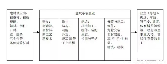 在產(chǎn)業(yè)鏈上,幕墻企業(yè)介于建筑業(yè)主(或建筑總包)與建材供應(yīng)商之間,其下游的業(yè)主對大型建筑工程的投資建設(shè)決定了建筑幕墻的市場需求,總包則負(fù)責(zé)建筑主體工程建設(shè)并協(xié)調(diào)相關(guān)專項(xiàng)分包商,對幕墻企業(yè)有重要影響;其上游則是鋁型材、玻璃、鋼材、石材、膠等各類建材企業(yè)。綜合性的建筑幕墻企業(yè)除了具有施工企業(yè)的一般特點(diǎn)外,還具有輕型機(jī)械制造企業(yè)和設(shè)計(jì)院的基本特征,幕墻行業(yè)也因此成為建筑業(yè)里最具技術(shù)含量的產(chǎn)業(yè),其與上下游的產(chǎn)業(yè)關(guān)聯(lián)關(guān)系表示如下: