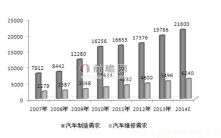 圖4 2007-2014年汽車細(xì)分領(lǐng)域聚氨酯用膠情況