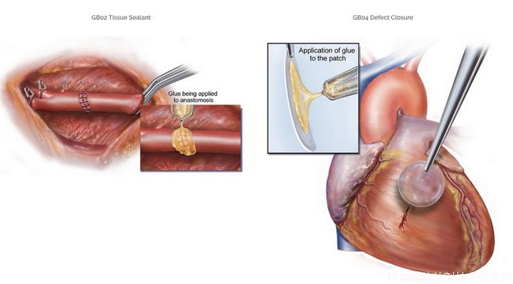 目前,Gecko有兩款產(chǎn)品正在開發(fā),一款為用于心血管重構(gòu)的組織密封劑GB02,另一款為缺損粘合的GB04。