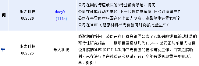 永太科技(002326)周三在全景網(wǎng)互動平臺上表示,公司正與華星光電積極開展的OLED和TFT-LCD用CF光刻膠的技術(shù)研發(fā)工作,目前進展順利,已在進行生產(chǎn)線驗證和測試,預(yù)計今年有望實現(xiàn)量產(chǎn)并實現(xiàn)訂單。