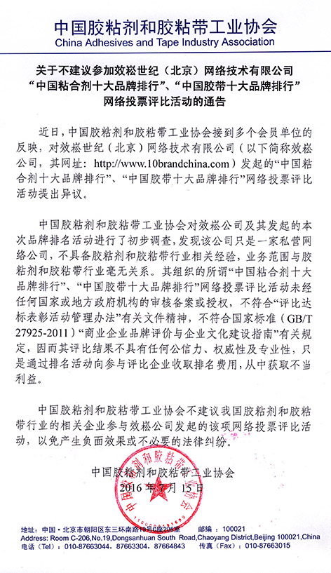 中國膠粘劑和膠粘帶工業(yè)協(xié)會不建議我國膠粘劑和膠粘帶行業(yè)的相關(guān)企業(yè)參與效崧公司發(fā)起的該項(xiàng)網(wǎng)絡(luò)投票評比活動,以免產(chǎn)生負(fù)面效果或不必要的法律糾紛。
