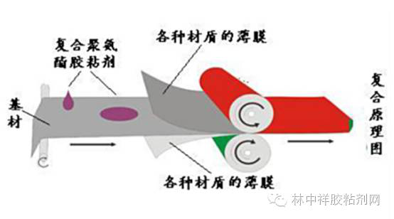 復合聚氨酯膠粘劑專指分子鏈中含有氨酯基(-NHCOO-)或異氰酸酯基(-NCO)類的膠粘劑,主要用于將兩種或以上不同或相同性質(zhì)的膜狀、片狀材料粘接,形成新復合材料的膠粘劑。原理見下圖: