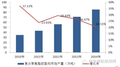 2009年以來,中國復合聚氨酯膠粘劑快速發(fā)展,產(chǎn)量以年均25%以上的速度持續(xù)增長。2013年、2014年,中國復合聚氨酯膠粘劑行業(yè)產(chǎn)量分別達到71.2萬噸、85.8萬噸,維持良好的增長勢頭。