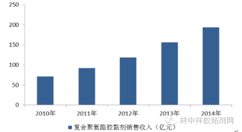 2013年度、2014年度,復合聚氨酯膠粘劑行業(yè)的銷售收入分別為156.5億元、193.7億元。