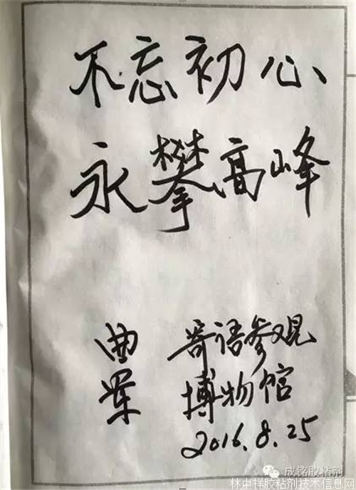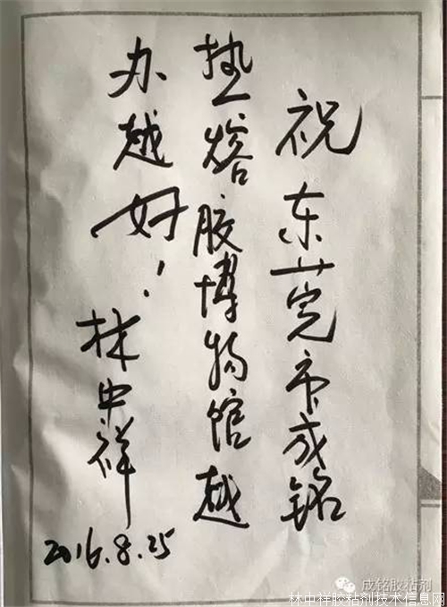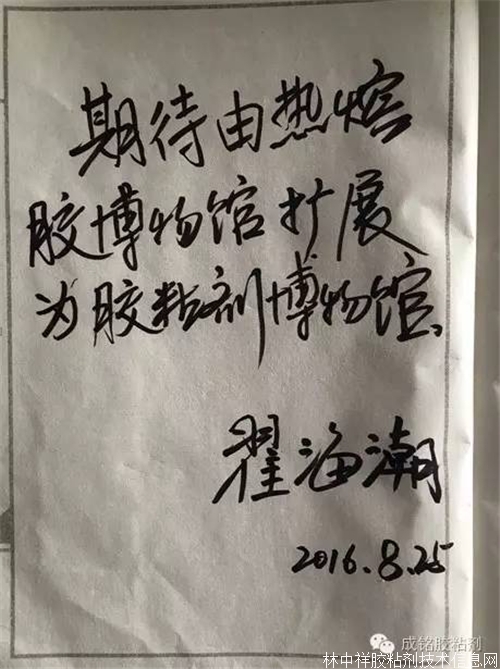 2016年8月25日,中國膠粘劑和膠粘帶行業(yè)年會剛剛在廣州落下帷幕,成銘科技園就迎來了西卡首席科學(xué)家曲軍博士、浙江大學(xué)范宏教授、上海康達新材陸巍總經(jīng)理、天山新材文人企業(yè)家翟海潮先生、南京林業(yè)大學(xué)林中祥教授、華南理工大學(xué)傅和青教授、亞利桑那化學(xué)石一峰博士、亞利桑那化學(xué)田建軍博士、萬事達膠帶熱熔膠應(yīng)用專家程世君先生等一批中國膠粘劑行業(yè)知名的專家學(xué)者。據(jù)悉,專家學(xué)者們此行的目的是專程來參加成銘熱熔膠博物館答謝活動的。