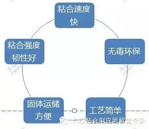 把膠粘劑加熱熔融成流體,涂布在被粘基材表面,將2個(gè)被粘物貼合,冷卻后形成粘接,之后利用空氣中的濕氣或被粘基材中的微量水分及其他含活潑氫的化合物與一NCO基團(tuán)發(fā)生反應(yīng)、擴(kuò)鏈,生成交聯(lián)網(wǎng)狀結(jié)構(gòu)且具有高內(nèi)聚力的聚合物,使粘接力進(jìn)一步增強(qiáng)。