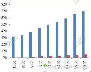 圖:2007-2015年中國(guó)膠粘劑和熱熔膠產(chǎn)量統(tǒng)計(jì)(單位:萬噸)