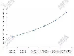 圖:2010-2015年中國(guó)TPU熱熔膠膜市場(chǎng)規(guī)模增長(zhǎng)趨勢(shì)(單位:億元)