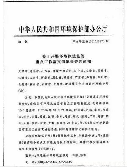 據(jù)悉,為了進一步督促地方人民政府及環(huán)境保護部門全面落實環(huán)境監(jiān)管責任,確保各項環(huán)境執(zhí)法監(jiān)管重點工作順利完成,環(huán)保部將組織10個督察組,自 2016年10月21日起,對天津、河北、山西、內(nèi)蒙古、遼寧、安徽、福建、江西、山東、河南、湖北、湖南、廣東、海南、四川、云南、陜西、甘肅、青海、新疆等20個省(市、區(qū))落實環(huán)境執(zhí)法監(jiān)管重點工作情況進行督察,每個省份至少檢查2個地市。督查時間為10天左右。
