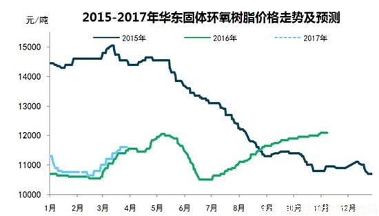 預(yù)計(jì)2017年中國環(huán)氧樹脂價(jià)格走勢仍隨原料成本起伏為主,受下游需求的影響利潤空間將出現(xiàn)短期的好轉(zhuǎn)或惡化,預(yù)計(jì)一季度國內(nèi)華東固體環(huán)氧樹脂價(jià)格區(qū)間在10600-12000元/噸。