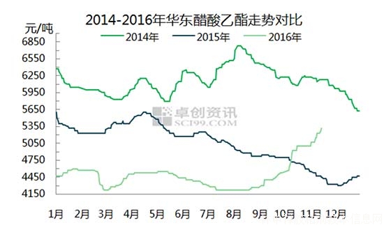 2016年,國內(nèi)醋酸乙酯市場雖低位運(yùn)行,但整體盈利尚可。2016年年初,醋酸乙酯市場成下行走勢,隨后的3-5月,化工市場回暖,醋酸乙酯市場緩幅上漲。5-8月季節(jié)性需求淡季,醋酸乙酯市場價(jià)格平穩(wěn)。8月之后,金九銀十傳統(tǒng)需求旺季來臨而工廠貨源供應(yīng)緊張,醋酸乙酯市場開始上行。2016年1-11月均價(jià)在4485元/噸,較2015年均價(jià)下跌10.66%。2017年,部分醋酸乙酯裝置有切換生產(chǎn)丁酯計(jì)劃,市場供求矛盾或有所減小,而原料面走勢預(yù)期與2016年相近,2017年,預(yù)計(jì)華東醋酸乙酯價(jià)格在4500-5500元/噸波動(dòng)。