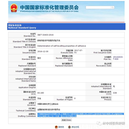 經(jīng)國(guó)家質(zhì)量監(jiān)督檢驗(yàn)檢疫總局、國(guó)家標(biāo)準(zhǔn)化管理委員會(huì)批準(zhǔn),根據(jù)國(guó)標(biāo)委2016年第27號(hào)公告,12月30日GB/T 33403-2016 《膠粘劑自流平性能的試驗(yàn)方法》正式發(fā)布,標(biāo)準(zhǔn)計(jì)劃編號(hào):20142633-T-606。