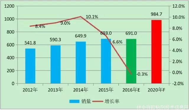 據(jù)賽瑞研究公布的預(yù)測數(shù)據(jù),2016年中國膠粘劑市場消量在690萬噸左右,比2015年的693噸略有下降,近5年來,首次出現(xiàn)負增長。