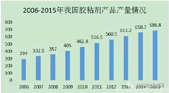 受國家經(jīng)濟(jì)持續(xù)增長,下游市場需求帶動以及國家產(chǎn)業(yè)政策的支持,膠粘劑行業(yè)近年來市場快速增長,國內(nèi)膠粘劑總產(chǎn)量從2006 年的294 萬噸增長到2015年的686.8 萬噸,年均復(fù)合增長率達(dá)9.89%。