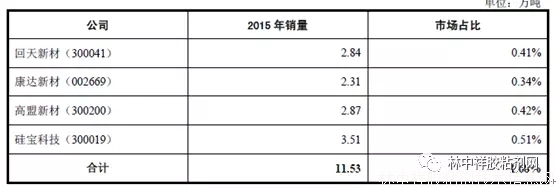 數(shù)據(jù)來源:各上市公司公開披露的年度報告等信息,市場占比以2015 年國內(nèi)膠粘劑產(chǎn)量686.8 萬噸計算。