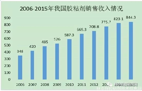 根據(jù)中國膠粘劑和膠粘帶工業(yè)協(xié)會統(tǒng)計數(shù)據(jù),2006 年我國膠粘劑市場銷售金額為348 億元,至2015 年已達(dá)844.3 億元,期間年均復(fù)合增長率達(dá)10.35%。