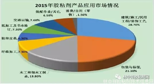 根據(jù)中國膠粘劑和膠粘帶工業(yè)協(xié)會統(tǒng)計數(shù)據(jù),膠粘劑的應(yīng)用市場主要包括建筑、施工、民用工程、裝飾工藝,包裝與標(biāo)簽,木工和細(xì)木工制品,紙加工及書本裝訂,纖維加工,交通運輸,制鞋和皮革,消費、自用(零售),裝配作業(yè)及其他等,應(yīng)用范圍非常廣泛,2015 年膠粘劑應(yīng)用市場情況如下: