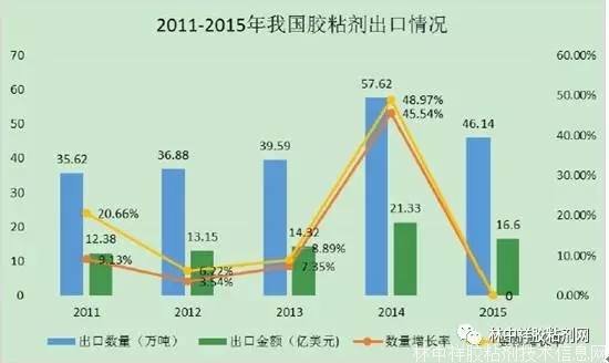 近年來,國內(nèi)膠粘劑的出口保持著較高的水平。根據(jù)中國膠粘劑和膠粘帶工業(yè)協(xié)會統(tǒng)計數(shù)據(jù),2015 年我國膠粘劑出口量為46.14 萬噸、出口額16.60 億美元,2011~2014 年膠粘劑的出口量和出口額的年均復(fù)合增長率分別為6.68%和7.61%。近年來世界膠粘劑產(chǎn)品生產(chǎn)正在向我國轉(zhuǎn)移,我國膠粘劑品牌國際市場開拓取得進(jìn)展,膠粘劑產(chǎn)品出口總體增長,出口產(chǎn)品檔次不斷提高,出口平均價格呈增長趨勢。但2015 年受全球經(jīng)濟(jì)不景氣的影響,我國膠粘劑產(chǎn)品的出口數(shù)量及金額均出現(xiàn)較大幅度的下滑,2015 年膠粘劑產(chǎn)品出口數(shù)量同比下滑19.92%,出口金額同比下滑22.15%。