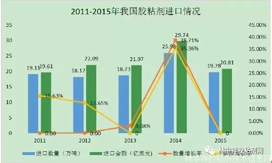 在進(jìn)口方面,根據(jù)中國膠粘劑和膠粘帶工業(yè)協(xié)會數(shù)據(jù),2015 年我國膠粘劑的進(jìn)口量為19.78 萬噸,進(jìn)口額20.81 億美元。