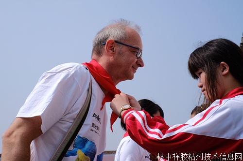 張家港市綠豐學校學生為阿科瑪(蘇州)高分子材料有限公司總經理Ludovic Fortin先生系上紅領巾