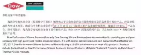 筆者從道康寧經(jīng)銷商和瓦克官網(wǎng)了解到,道康寧主要有機(jī)硅產(chǎn)品實(shí)施價(jià)格上調(diào),上調(diào)幅度為10%-15%,將于10月15日起執(zhí)行。