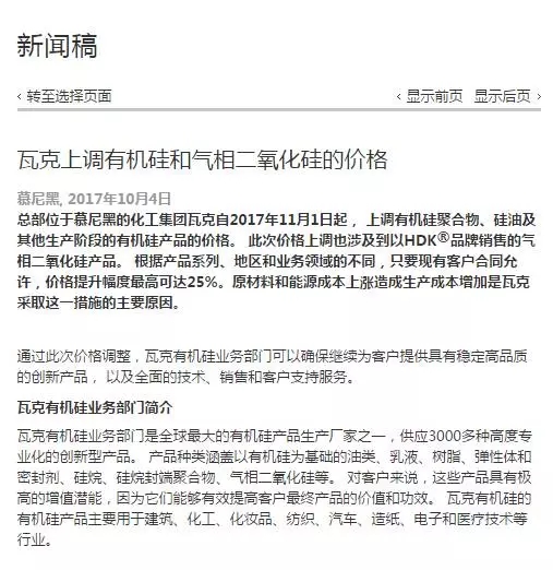 瓦克官網(wǎng)顯示:瓦克自2017年11月1日起,上調(diào)有機(jī)硅聚合物、硅油及其他生產(chǎn)階段的有機(jī)硅產(chǎn)品的價(jià)格。 此次價(jià)格上調(diào)也涉及到以HDK®品牌銷售的氣相二氧化硅產(chǎn)品。 根據(jù)產(chǎn)品系列、地區(qū)和業(yè)務(wù)領(lǐng)域的不同,只要現(xiàn)有客戶合同允許,價(jià)格提升幅度最高可達(dá)25%。