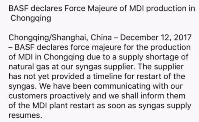 中國重慶/上海-2017年12月12日-巴斯夫宣布在重慶的MDI生產(chǎn)遇到不可抗力,原因是其合成氣供應(yīng)商的天然氣供應(yīng)短缺。該供應(yīng)商暫時沒有提供合成氣重啟的時間表。巴斯夫一直主動和客戶保持溝通。一旦合成氣供應(yīng)回復(fù),巴斯夫?qū)⒘⒓粗貑DI裝置并通知客戶。