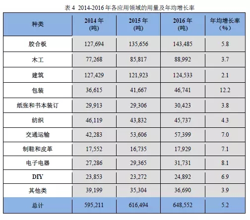 如果以膠粘劑應(yīng)用領(lǐng)域進(jìn)行劃分的話,可以分為:膠合板,占比22%;木工,占比13.6%;建筑,占比19.2%;包裝,占比7.2%;紙張和書本裝訂,占比4.8%;紡織,占比7.1%;交通運輸,占比8.8%;制鞋和皮革,占比2.8%;電子電器,占比4.9%,DIY,占比3.8%;其他類,占比5.7%,共11個細(xì)分應(yīng)用領(lǐng)域。同時我們對膠粘劑各個應(yīng)用領(lǐng)域從2014-2016年的用量進(jìn)行了統(tǒng)計,其中包裝領(lǐng)域的年均增長率最高,為12.2%;其次是電子電器領(lǐng)域,年均增長率達(dá)到8.1%;交通運輸、制鞋和皮革、膠合板、DIY的年均增長率分別為7.0%、7.1%、5.8%和6.9%;紙張和書本裝訂、紡織及其他類的年均增長率分別為3.8%、4.3%、3.9%;木工和建筑年均增長率略低,分別為3.7%和2.1%。