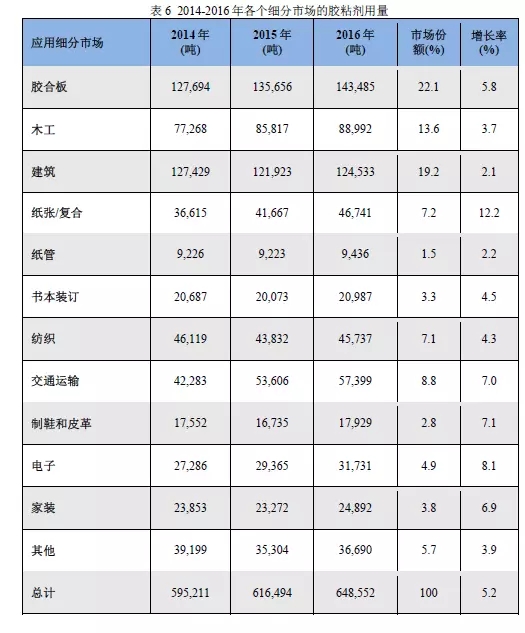 以膠粘劑應(yīng)用領(lǐng)域細(xì)分市場來統(tǒng)計的話,表6給出了2014-2016年各個細(xì)分市場的膠粘劑用量。其中整個市場份額最大的是膠合板,占比為22.1%,2014-2016年均增長率為5.8%。第二大的細(xì)分市場為建筑,占比19.2%,年均增長率為2.1%。排在第三位的是木工市場,占比13.6%,年均增長率3.7%。交通運輸、紙張/復(fù)合、紡織分別占比為8.8%、7.2%和7.1%。書本裝訂和紙管的細(xì)分市場別占比為3.3%和1.5%。制鞋和皮革用占比為2.8%,年均增長率為7.1%。電子、家裝和其他類的細(xì)分市場分別占比為4.9%、3.8%和5.7%。所有細(xì)分市場里增長較快的有紙張和復(fù)合市場,增長率達(dá)到12.2%,電子類市場增長也較快,增長率達(dá)到8.1%。增長較慢的有建筑市場和紙管加工,增長率分別為2.1%和2.2%。