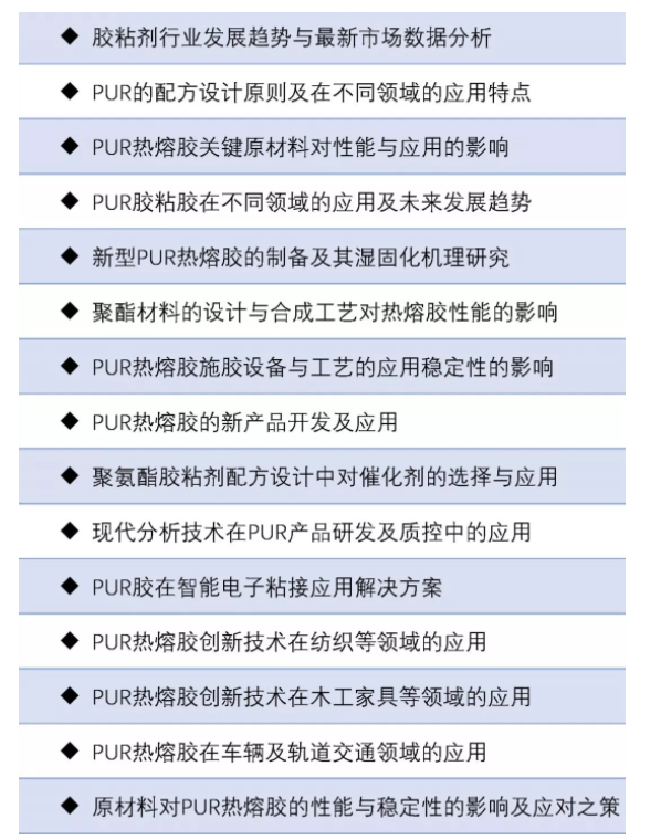 本次論壇將以“技術(shù)交流 應(yīng)用創(chuàng)新 上下游互聯(lián)”為主題,圍繞當(dāng)今PUR膠行業(yè)熱點(diǎn)、前沿和發(fā)展趨勢,共同探討PUR膠粘材料技術(shù)與創(chuàng)新應(yīng)用的發(fā)展方向。