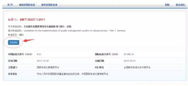 進入該標準界面。可以看到標準號、中英文標準名稱、標準狀態(tài)、中國標準分類號、國際標準分類號、發(fā)布日期、實施日期、主管部門、歸口單位、發(fā)布單位等重要信息。點擊“在線閱覽”。