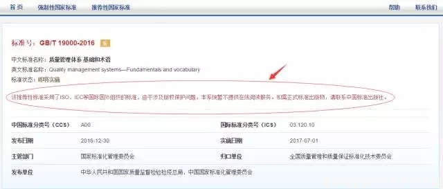 在查閱的過程中,小編也發(fā)現(xiàn),如果你查詢的推薦性標準采用了ISO、IEC等國際國外組織的標準,由于涉及版權保護問題,該系統(tǒng)暫不提供在線閱讀服務。如查閱 GB/T 19000-2016: