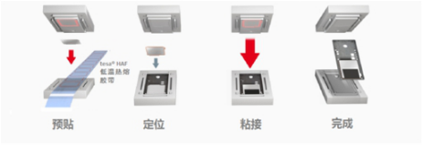 為了解決這一難題,德國著名膠帶公司德莎推出了低溫熱反應型HAF系列膠帶:tesa®5848X 及871X系列。這種低溫熱反應型膠帶具備普通高溫熱熔膠帶的極強粘接性,同時不需要使用高溫,僅需80 - 120°C就可激活其粘性,不會對高溫敏感型零部件本身造成傷害。