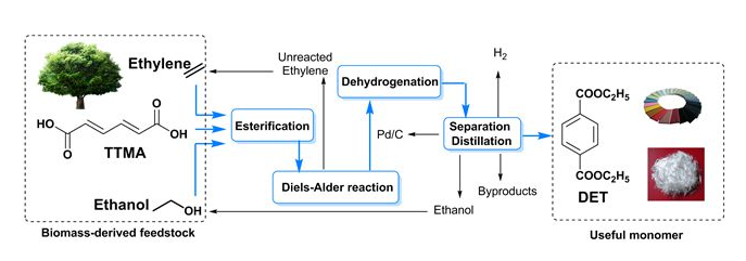 粘康酸可通過葡萄糖和木質(zhì)素等發(fā)酵制得,其分子結(jié)構(gòu)中含有一個共軛雙鍵和兩個羧基,與PTA分子相比,需要引入兩個碳原子來構(gòu)建苯環(huán)。但是,由于粘康酸的溶解性較差,且分子結(jié)構(gòu)中兩個吸電子的羧基使得粘康酸與乙烯的Diels-Alder反應(yīng)難以直接進行。為解決上述問題,研究人員引入關(guān)鍵的粘康酸與乙醇的酯化反應(yīng),產(chǎn)物二酯在醇中的溶解性較好,且酯基的吸電子能力弱于羧基,相比于粘康酸,更易與親雙烯體發(fā)生Diels-Alder反應(yīng)。經(jīng)過串聯(lián)的酯化、環(huán)加成和脫氫反應(yīng)后,對苯二甲酸二乙酯的總收率可達80.6%,并且產(chǎn)物可通過常用的蒸餾過程分離純化,從而實現(xiàn)了不經(jīng)過PX直接生成PTA衍生物的新技術(shù)路線。該研究為優(yōu)化利用生物質(zhì)基原料中已有的組成和特殊結(jié)構(gòu),制備高附加值的化合物提供了可能。