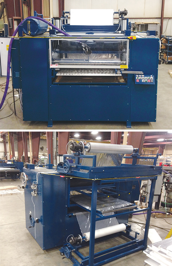 A range of products can be laminated to the EPS using the hot melt roller coater, including roofing materials, paper, packaging materials, fiberglass, non-woven materials and fabrics or textiles. When utilizing the Hot Roll Laminator portion of the machine, adhesive backed films and foils are easily laminated through the heated Teflon coated laminating rolls.