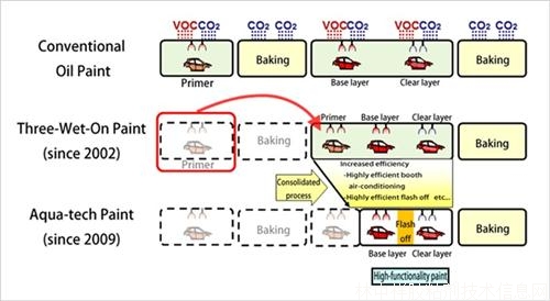 一是在現(xiàn)有涂裝工藝基礎(chǔ)上,開(kāi)發(fā)出功能性更強(qiáng)的全新涂料。馬自達(dá)給Aqua-tech涂裝系統(tǒng)帶來(lái)了兩種全新類別的頂級(jí)涂層涂料:水性著色底層涂料和氨基甲酸乙酯透明涂層涂料(第一次被日本汽車制造企業(yè)使用)。通過(guò)兩種創(chuàng)新涂料的應(yīng)用,揮發(fā)性有機(jī)化合物的排放量達(dá)到了行業(yè)內(nèi)最低的等級(jí),比三噴一烘涂裝工藝減少57%,比普通水性涂裝系統(tǒng)降低50%。