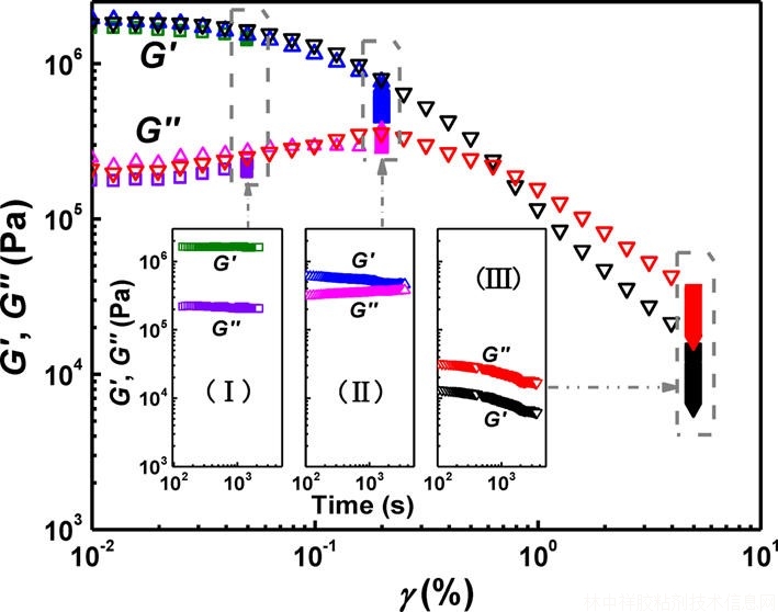 在高填充CB/NR體系中,貫穿橡膠基體的炭黑凝膠網(wǎng)絡(luò)(CBG network)被認(rèn)為是體系微觀效應(yīng)的直接體現(xiàn),在補(bǔ)強(qiáng)與非線性黏彈響應(yīng)中占據(jù)主導(dǎo)地位。鑒于此,我們通過(guò)長(zhǎng)時(shí)抽提實(shí)驗(yàn)獲得了本體CBG樣品,并系統(tǒng)比較了未填充塑煉膠、高填充混煉膠、本體CBG三者的動(dòng)態(tài)黏彈行為。研究發(fā)現(xiàn):CBG是處于Jamming態(tài)的軟玻璃材料,其Payne效應(yīng)的來(lái)源于應(yīng)變誘導(dǎo)的炭黑聚集體的漲落、遷移和重排(Jamming-Dejamming轉(zhuǎn)變)。高填充混煉膠的Payne效應(yīng)則源于CBG網(wǎng)絡(luò)的破壞與基體網(wǎng)絡(luò)解纏結(jié)的協(xié)同作用,基體纏結(jié)延遲了Payne 效應(yīng)的發(fā)生,并減弱了Payne 效應(yīng)幅度。另外,剪切誘導(dǎo)的Payne效應(yīng)具有明顯的時(shí)間依賴性,其中,CBG網(wǎng)絡(luò)可促進(jìn)結(jié)構(gòu)的快速回復(fù),而基體橡膠發(fā)生解纏結(jié)后則對(duì)結(jié)構(gòu)重建具有抑制作用。該研究成果于近期發(fā)表在Macromolecules, 2016, 49(4), 1454–1463.上。第一作者為碩士研究生甘順昌。