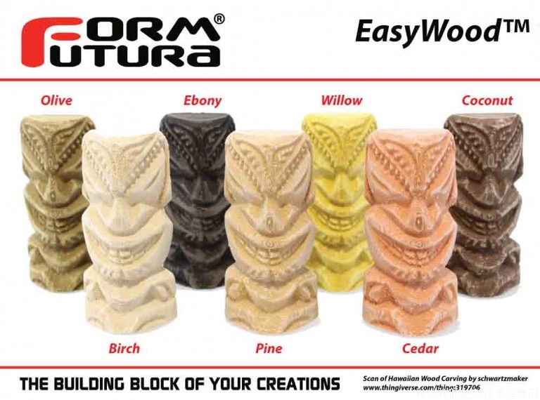 在過去一年里,該公司為其木質(zhì)3D打印線材系列EasyWood增加了三款獨(dú)特的產(chǎn)品Coconut(椰子)、Olive(橄欖)和Ebony(烏木),大受市場歡迎。由于這三種木質(zhì)線材的成功,如今,F(xiàn)ormfutura又發(fā)布了4種新型的木質(zhì)PLA EasyWood線,使該公司可供選擇的木質(zhì)3D打印線材達(dá)到了7種之多,每一種都代表了一個(gè)不同類型的木材。