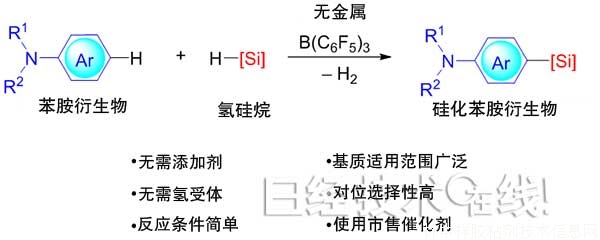 理研的研究小組在使用金屬催化劑的芳香族硅化合物硅化反應的過程中,對苯環(huán)上鍵合了二烷胺基(NR2)的苯胺化合物類嘗試進行硅化反應時發(fā)現(xiàn),不用金屬催化劑,僅靠少量有機硼化合物就能反應。進一步研究后發(fā)現(xiàn),僅以市售的“硼烷化合物B(C6F5)3”為催化劑,將苯胺類和氫硅烷加熱至120℃,就能高效合成導入多種有機硅成分的苯胺衍生物。