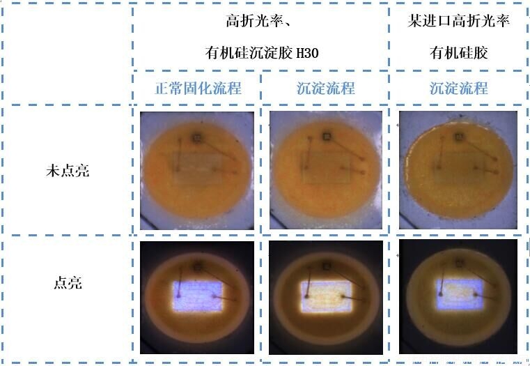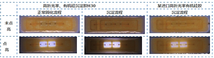 圖1. SMD熒光粉保形涂層:使用高折光率、有機(jī)硅沉淀膠H30,通過(guò)點(diǎn)膠實(shí)現(xiàn)熒光粉保形涂層(2835 SMD支架)。