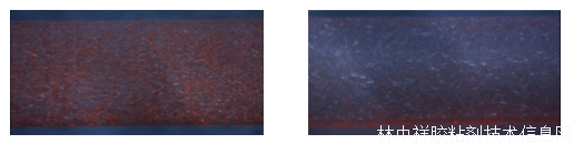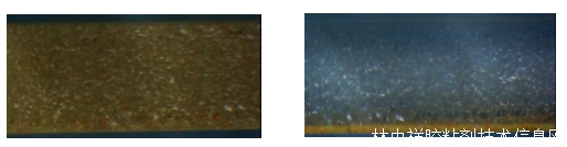 圖4. 紅色熒光粉和高折有機(jī)硅膠H30混合物固化后橫切面對(duì)比圖(圖左:采用正常固化流程,紅熒光粉較均勻地分散在硅膠中;圖右:采用沉淀+固化流程,紅熒光粉較均勻地分散在硅膠底部)。