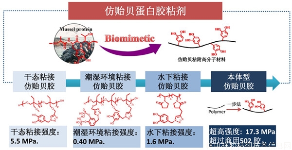 貽貝蛋白以在水下具備高強的粘附能力而聞名。根據(jù)仿生學原理,通過將貽貝粘附蛋白功能元(鄰苯二酚基團)與合成高分子相結(jié)合,達到復(fù)制甚至超越天然貽貝粘附蛋白粘附效力的目的,是目前仿貽貝蛋白膠粘劑(以下簡稱仿貽貝膠)領(lǐng)域研究熱點之一。近年來,青島能源所生物基材料重點實驗室萬曉波研究員率領(lǐng)的生物基及仿生高分子材料團隊一直致力于仿貽貝膠的研究,并取得了一系列進展。