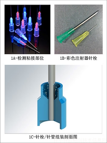 圖1C所示為針管和針?biāo)ńM裝的剖面圖。不銹鋼針管通常從注射器針筒底端穿過針?biāo)ǖ闹行模瑥尼標(biāo)ㄓ媚z粘劑固定針頭的井狀結(jié)構(gòu)出來。針?biāo)ǖ慕雍祥L度越長,接點(diǎn)的拉伸強(qiáng)度越大。