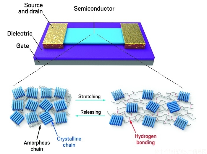 這種彈性晶體管由兩部分組成:一是剛性的半導(dǎo)體,二是連接這些半導(dǎo)體的無定形鏈。拉伸時(shí),無定形鏈間由氫鍵連接,收縮時(shí)氫鍵斷裂吸收機(jī)械應(yīng)力。來源:Nature/cen.acs.org