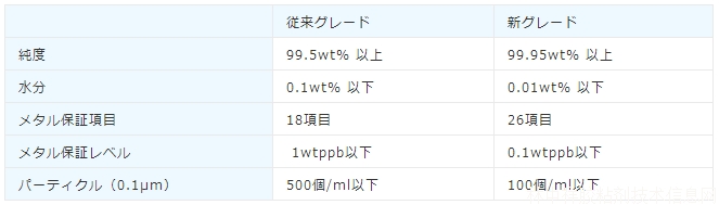 新級(jí)別產(chǎn)品的水分從原來(lái)的0.10wt%以下減至0.01wt%以下。金屬保證項(xiàng)目從18項(xiàng)增至26項(xiàng),金屬保證級(jí)別從1.0wtppb以下提高到0.1wtppb以下。每mL的顆粒(0.1μm)數(shù)量從500個(gè)以下減少至100個(gè)以下。