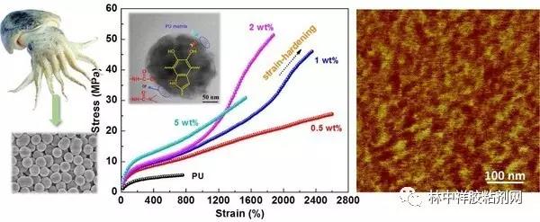 這項研究源于一次偶然發(fā)現(xiàn)。該學院的東為富教授一直致力于黑色素課題研究,在他的指導下,其研究生在測試聚氨酯的力學性能時,嘗試加入從烏賊墨囊中提取的黑色素。結(jié)果發(fā)現(xiàn),當把少量黑色素添加到普通聚氨酯中時,材料的拉伸強度和斷裂伸長率明顯提高,韌性增強10倍,增強效果要優(yōu)于碳納米管、石墨烯、纖維素等材料。今后通過此種方法將擁有更耐用的塑料泡沫或紡織品。
