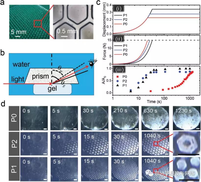 從聚兩性電解質(zhì)(PA)水凝膠表面結(jié)構(gòu)的光學(xué)和顯微鏡圖像(a)可以看出,在凝膠表面上形成了明顯的由凹槽分開的六邊形界面。作者設(shè)計(jì)了一種可以直接觀察水凝膠與基質(zhì)接觸過程的裝置(b)并制備了三種凝膠:平面P0凝膠、六邊形邊長為0.875 mm的凝膠P1和六邊形邊長為1.75 mm的凝膠P2,以此驗(yàn)證該實(shí)驗(yàn)的設(shè)計(jì)思路。結(jié)合位移、作用力及接觸面積比對(duì)時(shí)間的圖像(c)與接觸過程的照片(d)可看出,P0凝膠與玻璃的接觸從外圍開始,然后逐漸不規(guī)則地發(fā)展到整個(gè)區(qū)域。受力在22 s后迅速達(dá)到預(yù)設(shè)值,然而此時(shí)凝膠幾乎不與玻璃接觸,表明界面處的水還未被排出,即使在1000多秒后,照片中的一些區(qū)域仍然保持黑暗,同時(shí)許多黑點(diǎn)分布不均勻,表明出現(xiàn)了永久的“鎖水”。另一方面,P1和P2凝膠的接觸過程在30-40 s內(nèi)就已完成。1000 s后,P2凝膠的六邊形界面中心任然保持黑色,說明出現(xiàn)了“鎖水”,而P1凝膠則沒有此種現(xiàn)象。這一現(xiàn)象說明對(duì)于PA凝膠-玻璃體系,其出現(xiàn)“鎖水”的臨界六邊形邊長在0.875-1.75 mm之間。